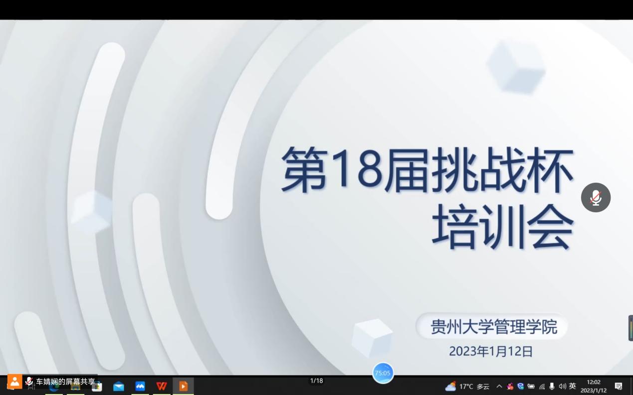 2023年1月12日上午10点,管理学院开展第十八届挑战杯线上培训会议。贵州大学正处级组织员、管理学院副书记(主持工作)周莉莉、管理学院双创导师团团长罗兰、管理学院双创导师团导师田馨、管理学院团委书记车婧娴,以及报名参加挑战杯的本科生和研究生共130余人参会。罗兰老师与田馨老师对参会同学进行培训,本次会议由车婧娴老师主持。