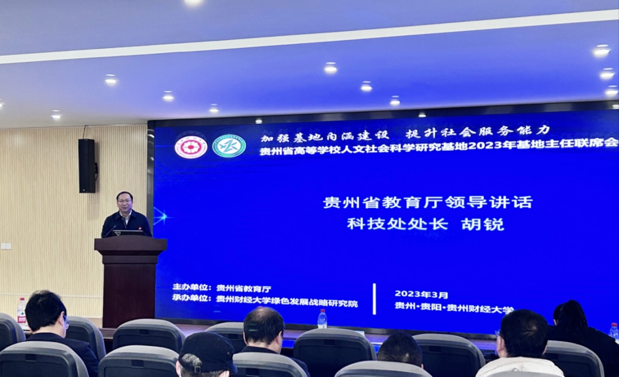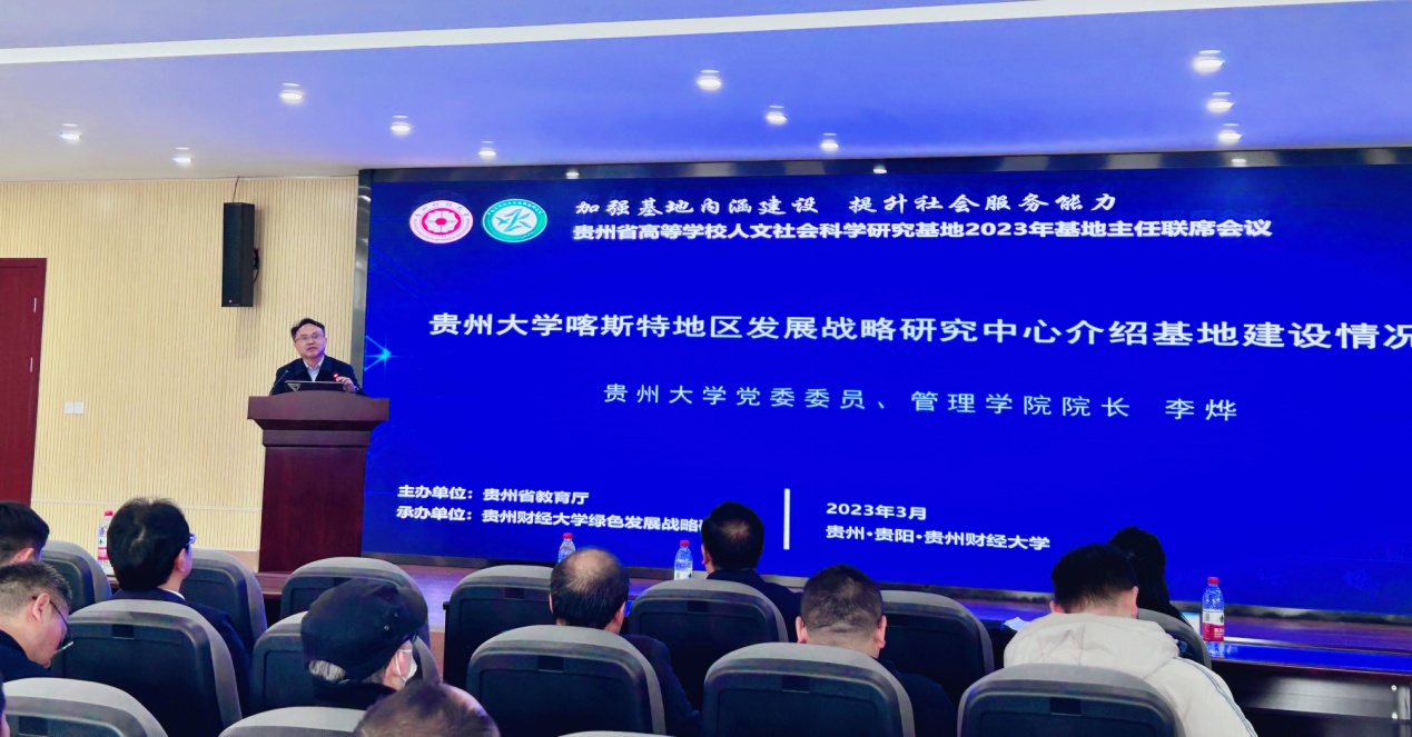 2023年3月31日,由贵州省教育厅主办、贵州财经大学中国西部绿色发展战略研究院承办、以“加强基地内涵建设 提升社会服务能力”为主题的2023年贵州省高等学校人文社会科学研究基地主任联席会议在贵州财经大学召开,全省高校人文社会科学研究基地负责人和部分业务骨干等60余人参会。校党委委员、管理学院院长、喀斯特地区发展战略研究中心主任李烨教授应邀参会并代表喀斯特基地作建设经验主题发言;基地副主任贺庆仁教授随行参加上述活动。