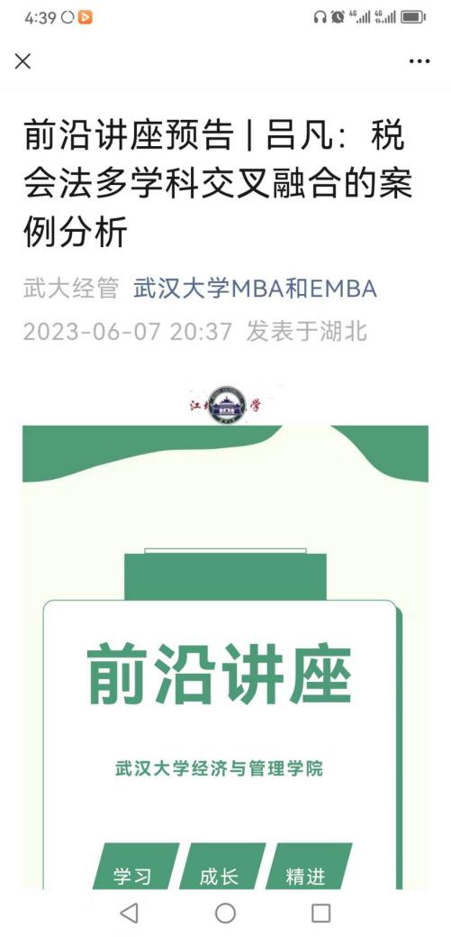 6月10日,管理学院会计系主任吕凡老师应邀前往武汉大学经济与管理学院,开展“税会法多学科交叉融合的案例分析”专题讲座。