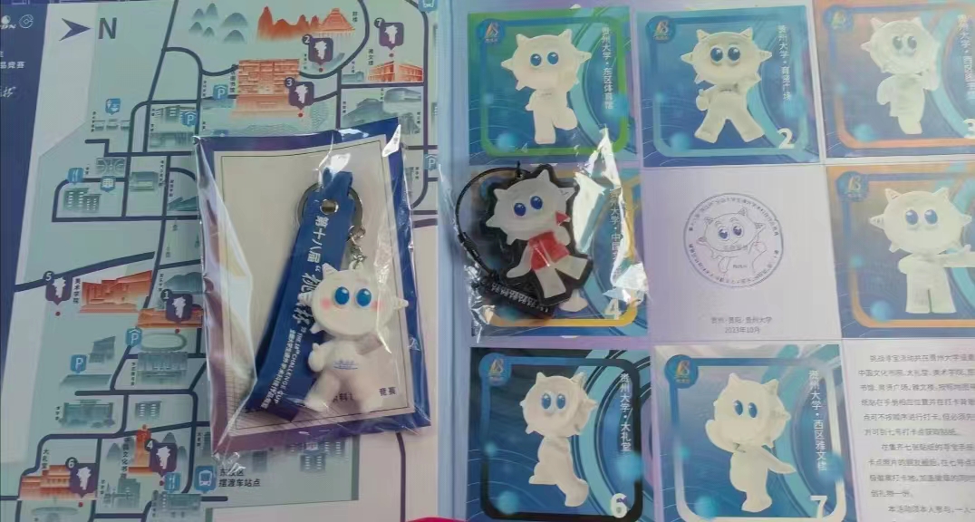 具有青春和时代气息,造型生动、亲切可爱,体现贵州省及贵州大学特色的挑战杯吉祥物“天宝”随处可见,还有钥匙扣、冰箱贴、手办等周边礼品,让学校里面充满了“天宝海”。